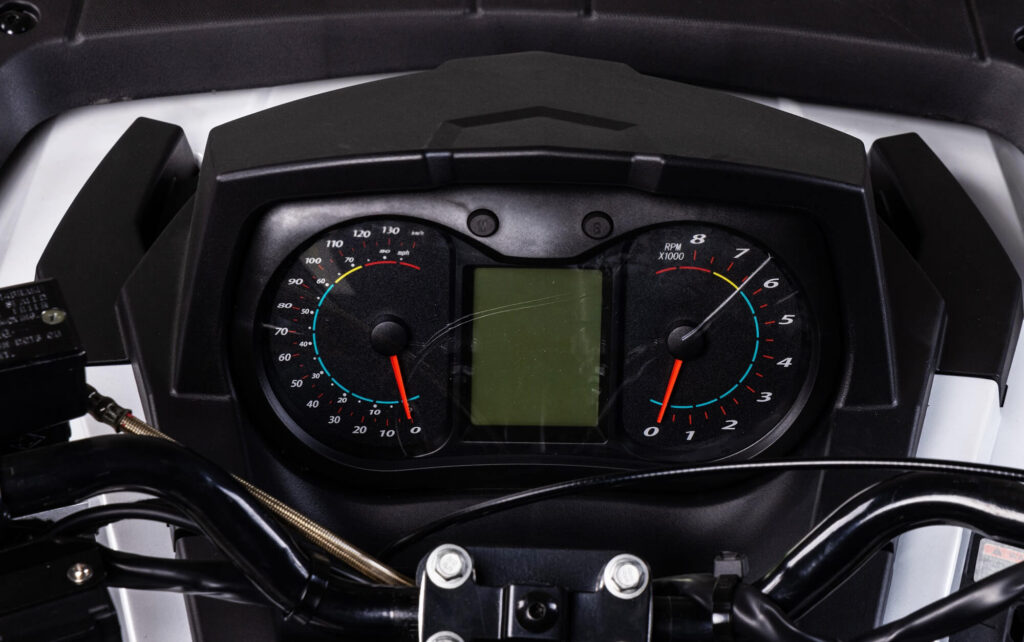 Vehicle Speed, Engine Speed, total miles, Turn signal (left, right), Headlight (High / Low beam), ECU, Fuel Level, Coolant Temp, Park indicator, Oil indicator, Battery indicator and brake failure indicator all integrated.